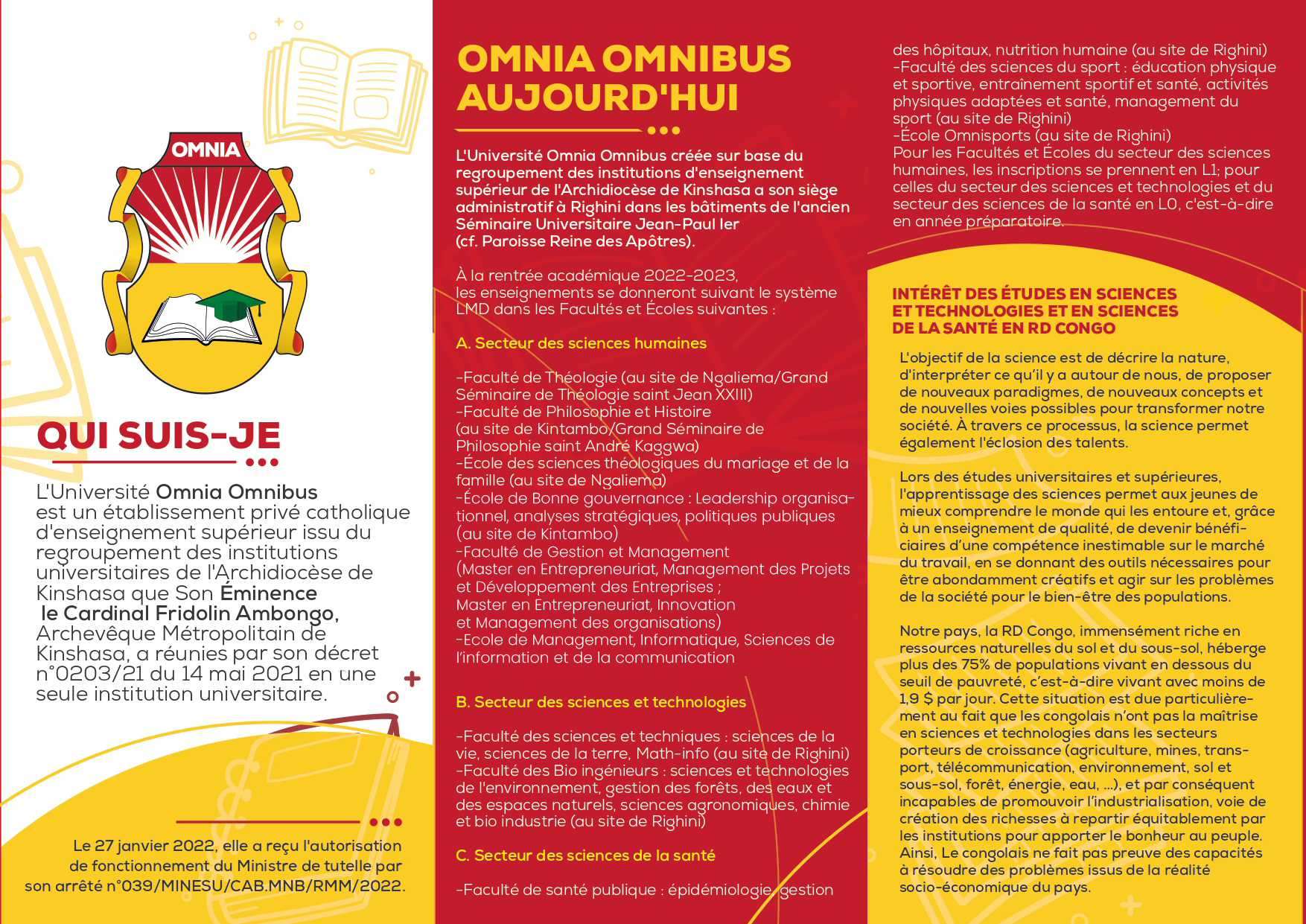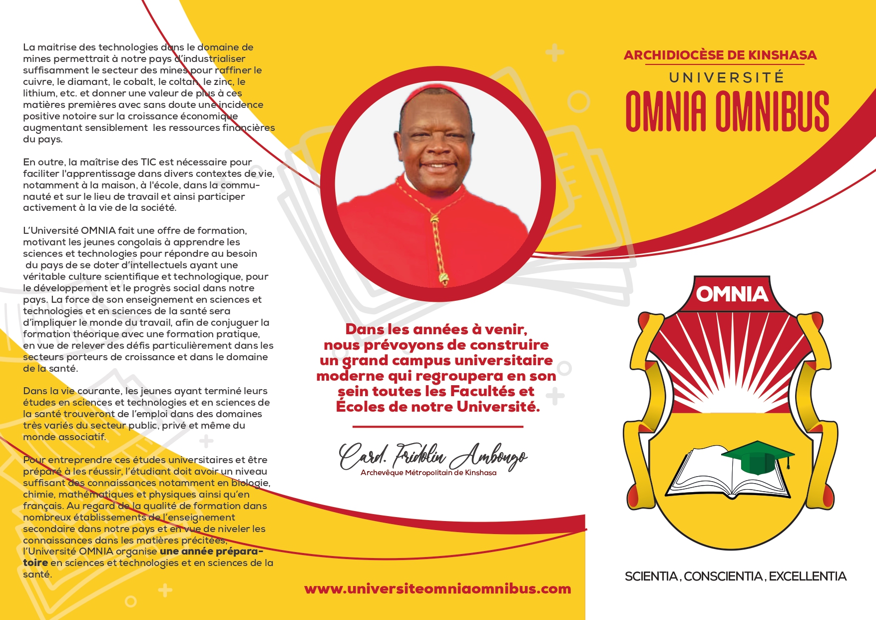 L’homme d’aujourd’hui plus que d'hier a l’impératif de tirer leçon des dégâts causés faute de la manipulation de la science. Voilà pourquoi l’Omnia a l’ambition de former une jeunesse consciente des conséquences néfastes d’une science sans conscience en vue de protéger, préserver et promouvoir les valeurs humaines et spirituelles de l’humannité.